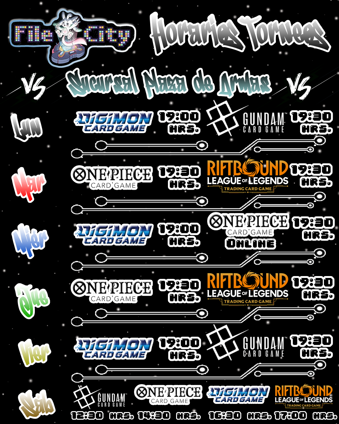 Lunes: Digimon Card Game 19:00 hrs. / Gundam Card Game 19:30 hrs.
